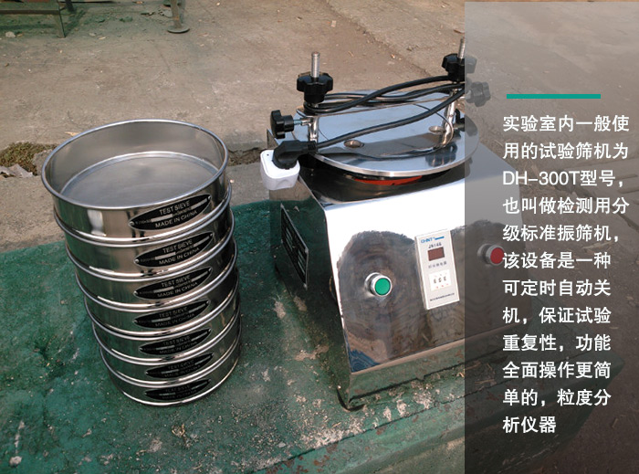 實驗室內一般使用的試驗篩機為DH-300T型號,也叫做檢測用分級標準振篩機,該設備是一種可定時自動關機,保證試驗重復性,功能全面操作更簡單的,粒度分析儀器?蓪⒁环N顆粒料同時精密分出2~8個粒子段?捎糜跐{液料的細度及雜物含量分析,噪音小,重量輕;平臺操作,無須固定。調節(jié)振動快,可調節(jié)振幅。