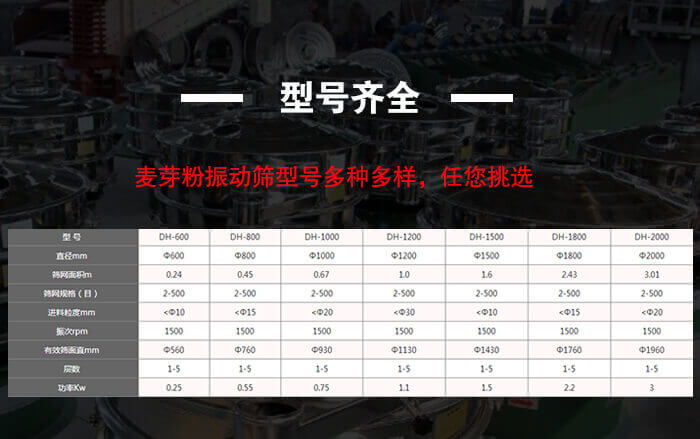 振動(dòng)篩的型號(hào)有:DHC-400;DHC-600;DHC-800;DHC-1000;DHC-1200;DHC-1500;DHC-1800;DHC-2000,麥芽粉振動(dòng)篩型號(hào)多種多樣,任您挑選