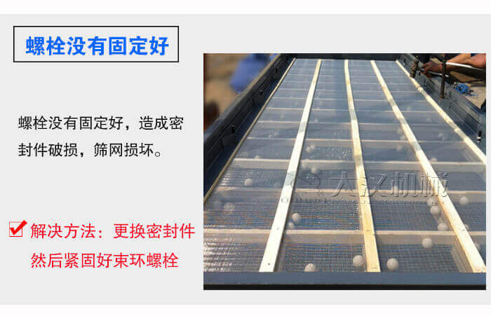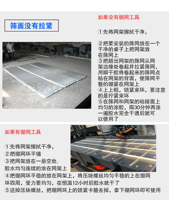 在篩網(wǎng)沒(méi)有拉緊的情況下,篩箱支撐條就會(huì)與篩網(wǎng)產(chǎn)生二次振動(dòng),在相互撞擊后導(dǎo)致篩網(wǎng)破裂,這種情況出現(xiàn)只需要拉緊篩網(wǎng)就好了。