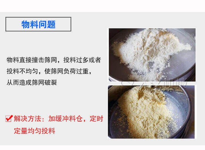 物料直接撞擊篩網(wǎng),投料過(guò)多或者投料不均勻,使篩網(wǎng)負(fù)荷過(guò)重,從而造成篩網(wǎng)破裂