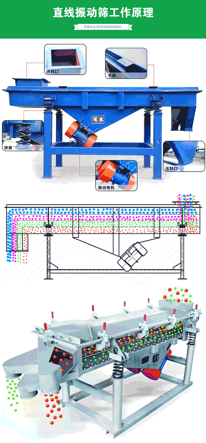 直線振動(dòng)篩采用雙振動(dòng)電機(jī)驅(qū)動(dòng),當(dāng)兩臺(tái)振動(dòng)電機(jī)做同步、反向旋轉(zhuǎn)時(shí),其偏心塊所產(chǎn)生的激振力在平行于電機(jī)軸線的方向相互抵消,在垂直于電機(jī)軸的方向疊為一合力,因此篩機(jī)的運(yùn)動(dòng)軌跡為一直線。其兩電機(jī)軸相對(duì)篩面有一傾角,在激振力和物料自重力的合力作用下,物料在篩面上被拋起跳躍式向前作直線運(yùn)動(dòng),從而達(dá)到對(duì)物料進(jìn)行篩選和分級(jí)的目的。可用于流水線中實(shí)現(xiàn)自動(dòng)化作業(yè)。具有能耗低、效率高、結(jié)構(gòu)簡(jiǎn)單、易維修、全封閉結(jié)構(gòu)無(wú)粉塵溢散的特點(diǎn)。最高篩分目數(shù)400目,可篩分出7種不同粒度的物料。