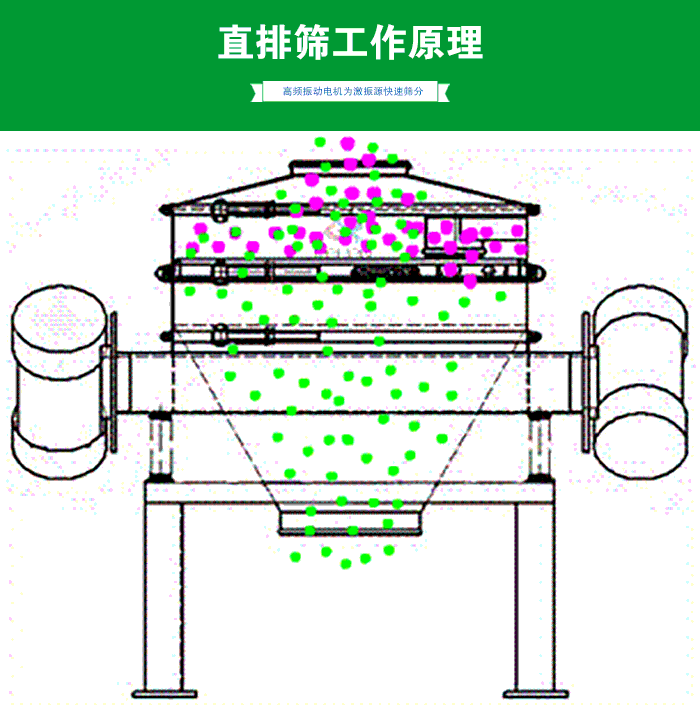 由直立式電機(jī)作激振源,電機(jī)上、下兩端安裝有偏心重錘.將電機(jī)的旋轉(zhuǎn)運(yùn)動(dòng)轉(zhuǎn)變?yōu)樗、垂直、傾斜的三次元運(yùn)動(dòng),再把這個(gè)運(yùn)動(dòng)傳遞給篩面。調(diào)節(jié)上、下兩端的相位角.可以改變物料在篩面上的運(yùn)動(dòng)軌跡。適合食品、制藥、化工、冶金等行業(yè)。