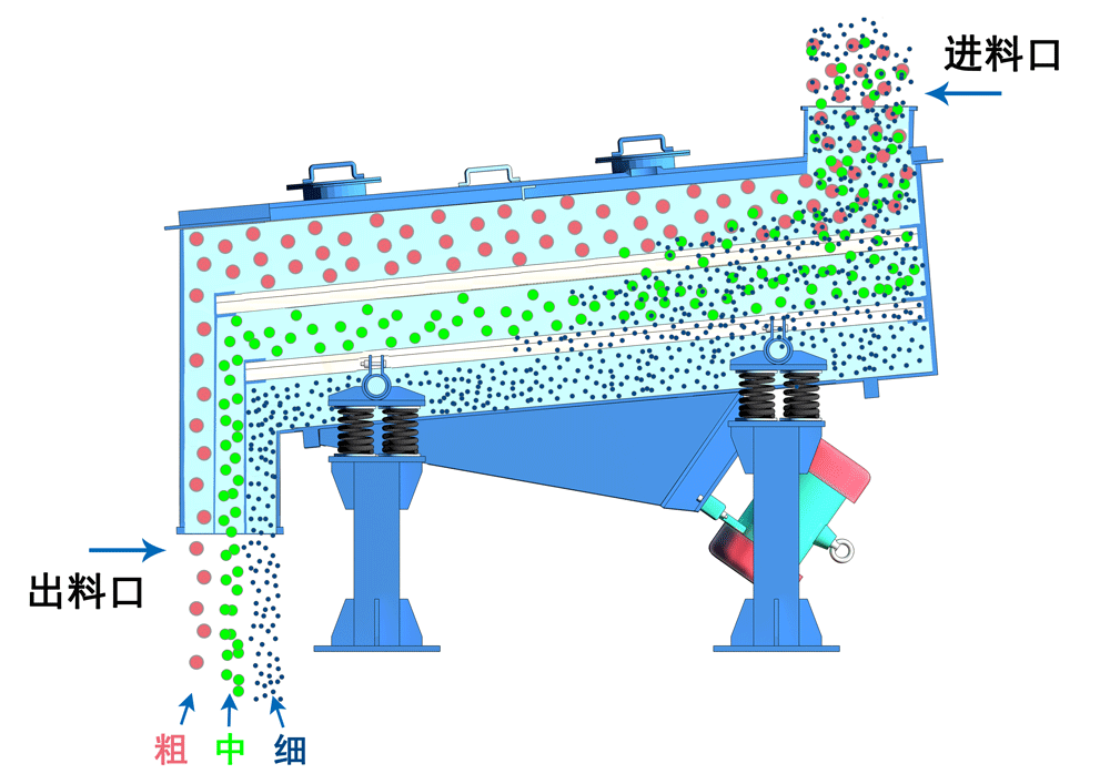 直線(xiàn)運(yùn)動(dòng)振動(dòng)篩借助振動(dòng)電機(jī)產(chǎn)生的激振力,驅(qū)動(dòng)篩箱做定向直線(xiàn)往復(fù)運(yùn)動(dòng),以此實(shí)現(xiàn)物料篩分。工作時(shí),物料從進(jìn)料口均勻進(jìn)入篩面,在篩箱的直線(xiàn)運(yùn)動(dòng)作用下,沿著篩面持續(xù)向前移動(dòng)。篩網(wǎng)有1-5層可選,通常1層是簡(jiǎn)單的除雜,2-3層篩網(wǎng)能將物料分為3-4個(gè)粒度等級(jí),從而完成粗、中、細(xì)的篩分需求,4-5層篩網(wǎng)主要完成物料的精細(xì)化分級(jí)。通過(guò)這種直線(xiàn)運(yùn)動(dòng)主導(dǎo)的分級(jí)方式,可完成2-6個(gè)粒度等級(jí)的物料分離。