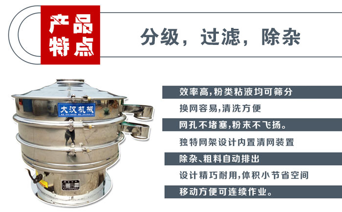 "大漢"DH系列振動篩產(chǎn)品,經(jīng)客戶多年使用,獲得大量的一線反饋建議,在自有成熟的篩機制造技術基礎上,大漢機械工程師以滿足客戶需求為標準,多次技術改進,篩分效果更加優(yōu)越,采用"通用"動力激振器,三維動力更加突出,適用范圍更加廣泛,大漢機械公司可根據(jù)客戶需求設計特殊型號,無論物料是干是濕,是精細是粗糙,是比重大是比重輕,0-400目都可以篩選,不管是液態(tài),還是漿狀的0-600目都可以過濾。"大漢"旋振篩系列產(chǎn)品同時配備專門的篩網(wǎng)清理裝置,把堵網(wǎng)率降低,過網(wǎng)率和處理精度得以有效提高。"大漢"具備特殊型號制造的能力讓顧客對"大漢"有更多的選擇。