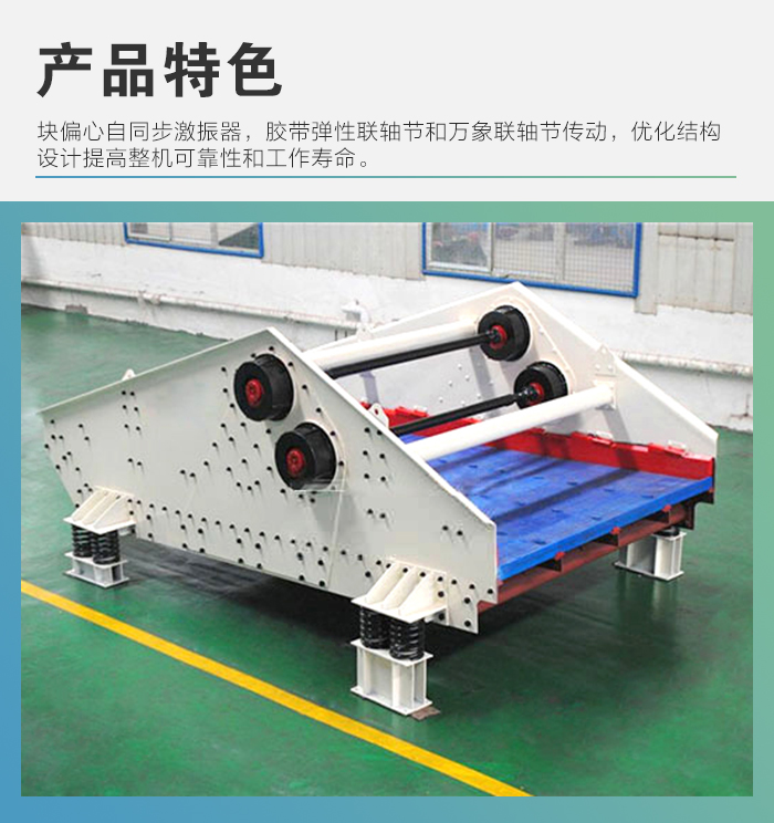 1.采用塊偏心自同步激振器。 2.采用膠帶彈性聯(lián)軸節(jié)和萬象聯(lián)軸節(jié)傳動 3.優(yōu)化結(jié)構(gòu)設(shè)計提高整機可靠性和工作壽命