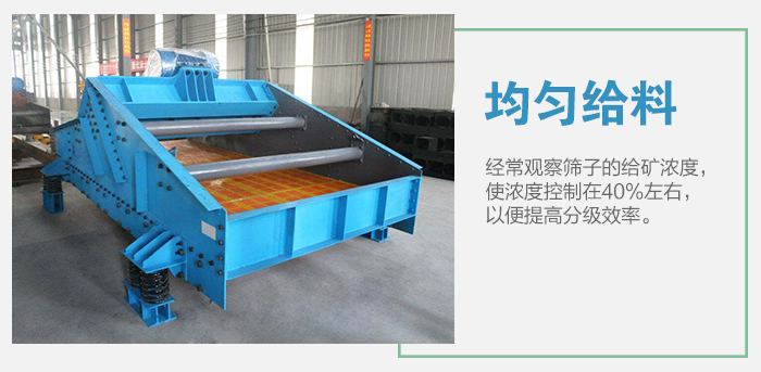 1、設(shè)備正常運轉(zhuǎn)時,應(yīng)經(jīng)常觀察篩子的給礦濃度,使?jié)舛瓤刂圃?0%左右,以便提高分級效率。 2、因該篩分級效率高,脫水性能好,篩上量濃度高,使得篩上量溜槽中的礦漿流動性差,應(yīng)配上水管。