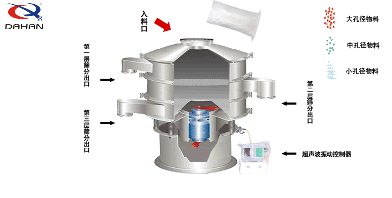 大漢公司根據(jù)多年精細(xì)分級的經(jīng)驗設(shè)計的DH超聲波振動篩分機(jī)。使用智能振動超聲激振器,改變了單一頻率帶來不適應(yīng)性和不可調(diào)性,實現(xiàn)超聲波與振動篩的有機(jī)結(jié)合,解決強(qiáng)吸附性、易團(tuán)聚、高靜電、高精細(xì)、高密度、輕比重等篩分難題。